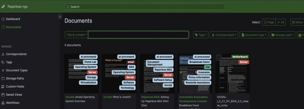Paperless AI is the one doing the heavy lifting. It reads the text in your documents and handles tagging, document types, correspondents, and titles. It's also got a RAG chat feature so you can ask questions across your entire collection.